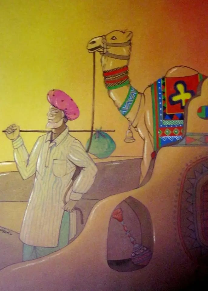 - Intricate Detail: The artist has meticulously captured the intricate details of the man’s attire and the camel’s adornments, showcasing the rich cultural heritage of Rajasthan.