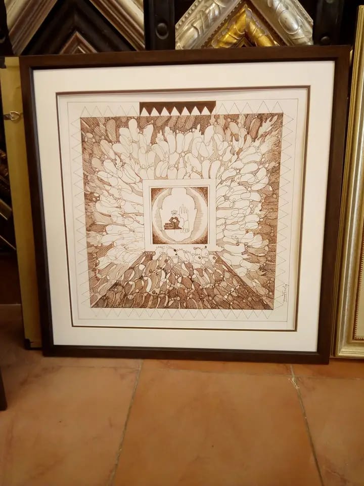 This captivating artwork is a hand-drawn sketch that explores the theme of unity and togetherness. The artist has skillfully used brown ink to create a mesmerizing pattern of interconnected figures, symbolizing the interconnectedness of all beings. The central figure, holding a book, represents knowledge and wisdom, suggesting that education and understanding are key to fostering unity. The artwork is framed in a classic brown frame that complements the artwork’s aesthetic and adds a touch of elegance.