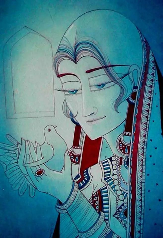 This captivating painting captures the essence of tranquility and connection with nature. A young woman, adorned in traditional attire, gazes lovingly at a delicate bird perched on her hand. The soft hues and intricate details of the woman’s attire and the bird’s delicate features create a sense of peace and harmony. The artist’s skillful use of light and shadow adds depth and dimension to the scene, inviting the viewer to connect with the intimate moment between the woman and the bird. This artwork is a celebration of nature’s beauty and the enduring bond between humans and animals.