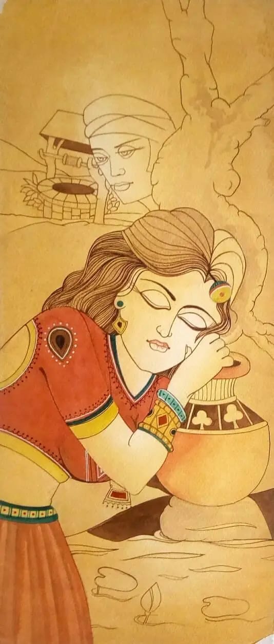 This captivating painting transports you to a serene village scene. A young woman, lost in thought, leans against a water pot, her eyes closed in contemplation. The intricate details of her attire, the soft hues of the background, and the gentle touch of the artist’s brushstrokes create a sense of tranquility and peace. The distant figure of a man by the well adds a touch of mystery to the scene, inviting the viewer to imagine the story behind this moment. This artwork is a celebration of rural life, capturing the essence of a simple yet profound moment.