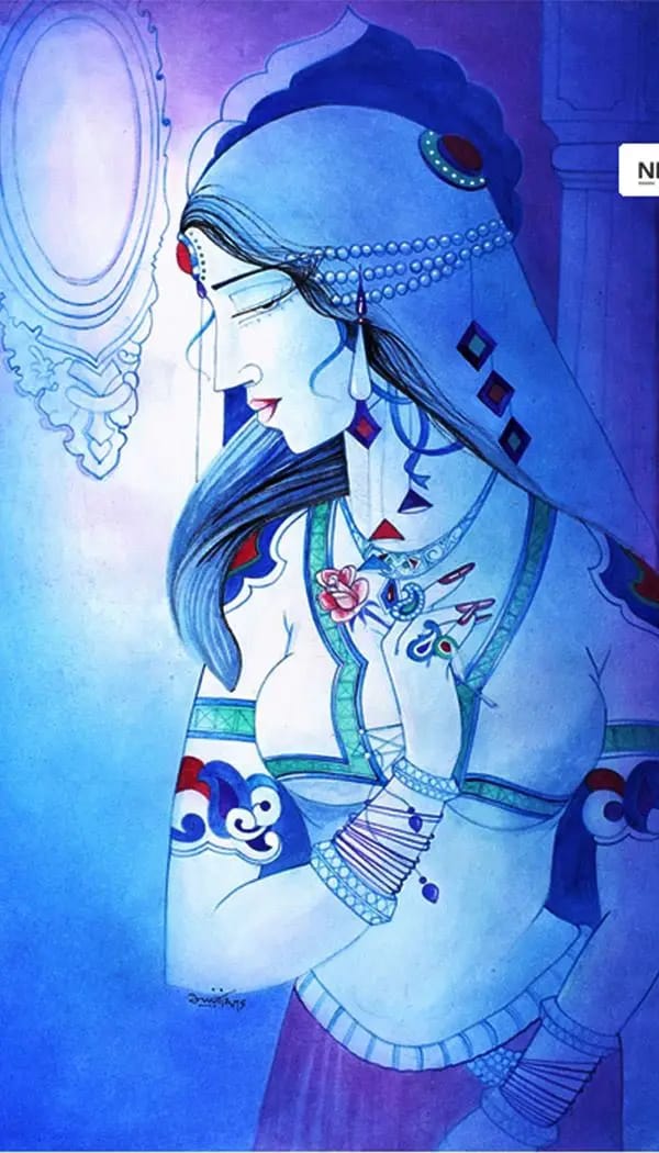This captivating watercolor artwork titled “Sapphire Dreams” transports you to a realm of elegance and mystery. The painting portrays a woman of timeless beauty, her gaze lost in contemplation as she gazes into a mirror. Her flowing hair, adorned with intricate jewelry, cascades down her shoulders, creating a sense of movement and grace.