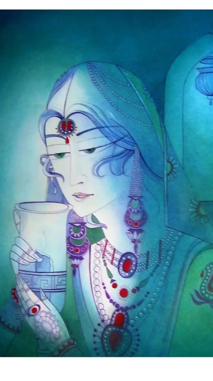 This captivating watercolor painting portrays a serene and elegant woman lost in thought as she savors a cup of tea. The artist has skillfully captured the delicate details of her features, from the intricate patterns on her attire to the subtle expression on her face. The cool blue and green hues of the painting create a calming and tranquil atmosphere, inviting the viewer to share in the woman’s moment of quiet contemplation.